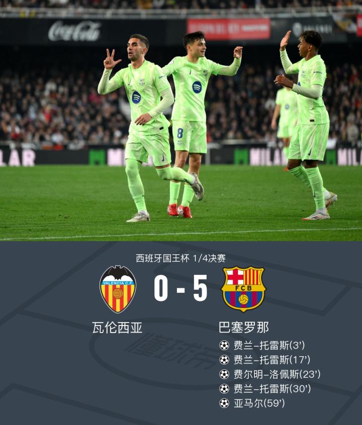 整场比赛结束,巴塞罗那以5-0大胜瓦伦西亚,成功晋级国王杯4强。这场胜利不仅是对球队实力的肯定,也是对球员们辛勤训练和努力付出的回报。巴塞罗那在国王杯赛场上展现出了强大的统治力,令人期待他们在接下来的比赛中能够再创佳绩。